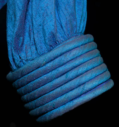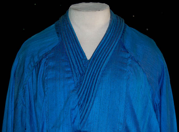 Description: A casual shirt featured in the Star Trek: The Next Generation episode “Ménage a Troi” for wear by “Commander Riker” (Jonathan Frakes) while visiting the planet Betazed with “Councilor Troi” (Mirina Sirtis). The shirt is a very sharp colored blue, long sleeved, with a tough neck featuring multiple lines of piping as do the cuffs. The costumer's tag reads ‘#172, “Riker”, 1 civilian shirt – aqua w/ pleated v-neck’.