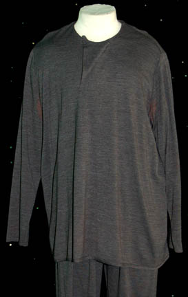 Description: A costume lot featured in the Star Trek: The Next Generation episode “Frame of Mind” in which “Commander Riker” (Jonathan Frakes) finds himself locked inside an alien asylum and has to rediscover the aspects of his personality in an effort to escape! The costume is his asylum wear, a pair of gray shirts that snap across the neck giving it an off center seam and a pair of matching trousers. One of the shirts does not snap across the top, but all garments feature sewn in The Next Generation tags reading ‘Jonathan Frakes' and others indicating use by other actors. The costumer’s tag reads ‘#247 TNG “Frame of Mind” RIKER, Jonathan Frakes’ and indicates the components.