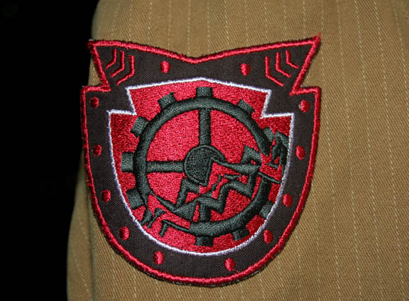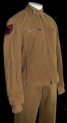Description: A costume featured in the Star Trek: Enterprise episode “The Communicator” for wear by actors portraying alien soldiers. These excellent three piece uniforms are made up of a pair of olive drab colored trousers with white pinstripes, a matching jacket with silver colored zipper pockets and red sewn on shoulder patches with black details, and a reflective green long sleeved button front shirt. The sewn in Enterprise tag indicates wear in the episode.