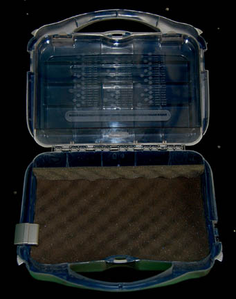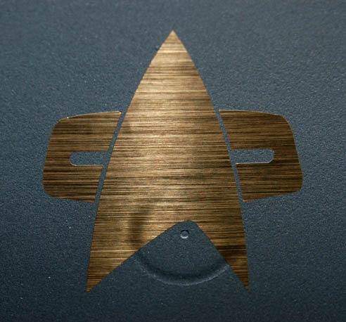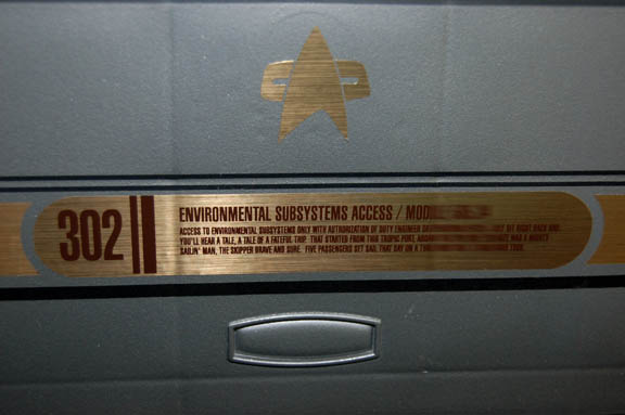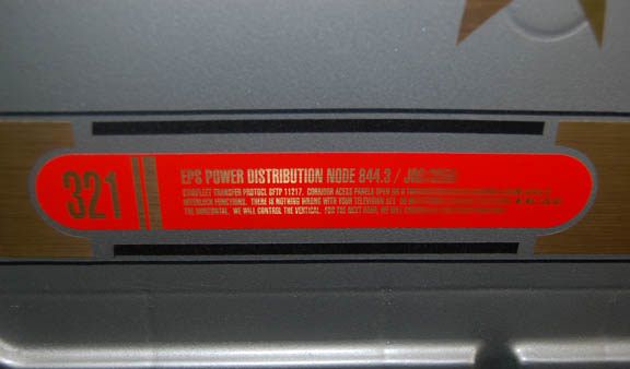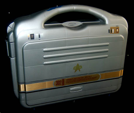 Description: This is a 24th century carry case the style of which made appearances in feature films set in the 24th century, later seasons of Star Trek: Deep Space Nine and possibly Voyager. The case was originally blue but custom painted silver with small metallic applications to simulate control features. On both sides of the case are applied metallic Starfleet emblems as well as systems labels. One is titled “EPS Systems Power Distribution Node”, the other is titled “Environmental Subsystems Access”. Due to time and storage conditions, there is some damage to the paint around the sides of the case and the handle. One clip has a hard time staying closed due to slight warping. Inside the case are twenty small compartments protected by a clear piece of acrylic that snaps shut. Measures approx. 18 ½ x 15 x 5 inches.