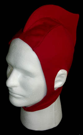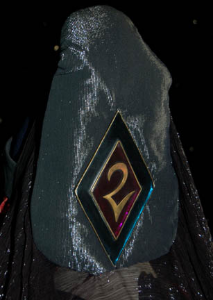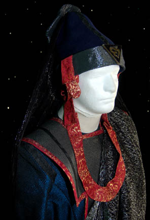 Description: A costume featured in the classic Star Trek: The Next Generation episode “Data's Day” for wear by “Ambassador T’Pel” (Sierra Pecheur) visiting the “Enterprise-D” en route to the neutral zone for a meeting with the Romulans. The costume is an incredible Vulcan robe, made up of a reflective blue fabric with inset black lines, a long tabard with red and gold leaf trim with metallic silver dots throughout, and a blue felt hat with silver colored headband and brace affixed to the back with a large Vulcan badge on back and a smaller triangular one in the front with an attached chinstrap and a long, flowing black drape with silver sparkling lines. The costume also comes with a maroon colored skullcap with a front to back ridge running the crown and a long draping scarf made of similar fabric as the one attached to the hat. Both pieces of headwear feature sewn in costume manufacturer’s tags reading ‘Harry Hatz’ and the costumer’s tag reads ‘#185 Data’s Day, T’Pel, Sierra Pecheur’.