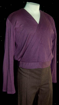 Description: A two-piece costume featured in the episode “Allegiance” for wear by Patrick Stewart in his portrayal of “Captain Picard”, albeit, he was a duplicate of his usual character while he wore it, he still kissed “Dr. Crusher” (Gates McFadden) in this costume! The costume is a pair of brown trousers and a purple double breasted shirt with long sleeves and a system of snaps and clasps across the front of the body. The shirt is also pleated for a ribbed effect and opens in a “v” to expose the chest. The costumer's tag reads ‘166 Allegiance, Picard, Patrick Stewart, shirt, pants’.