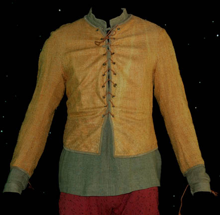 Description: “Hali” (James McIntire) was a Mintakan hunter sent to hunt down “Wil Riker” (Jonathan Frakes) in the Star Trek: The Next Generation episode “Who Watches the Watchers”. The terracotta colored pants have small raised bobbles in black and terracotta and built in feet. The shirt is olive green with three matching rope tassels hanging down each side of the V-neck. The mustard color over shirt has laces up the front and up the sleeves. It has a suede rectangular patch on the back and suede trim. Costume comes complete with costume tag. The sewn in tags indicate that the costume was reused during the Star Trek: Deep Space Nine series. The mustard color over shirt has been altered since its first use in „Who watches the watchers“. It was reused in the TNG episode „Homeward“. A sewn in tag says „ Keno Deary“. Keno K. Deary is an actor who appeared as a Boraalan in the Star Trek: The Next Generation seventh season episode "Homeward". As a background actor he received no credit for his appearance.