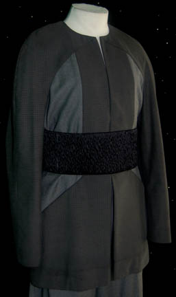 Description: This costume was worn by “Dr. Syrus” (David Selburg); a fictitious psychiatrist devised by “Suna” (Andrew Prine) in order to extract tactical information from “Commander Riker” (Jonathan Frakes) in the Star Trek: The Next Generation episode “Frame of Mind”. The costume includes a lab style gray coat with square patterned fabric interspersed with plain gray fabric. The matching pants are also gray. Worn around the waist is a black ruffled cumber band. Costume comes complete with costume tag showing wear by Dr. Syrus, however the sewn in tags read “Voyager – Daniel Zacapa” indicating that the costume was also reused in the Voyager series.