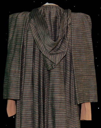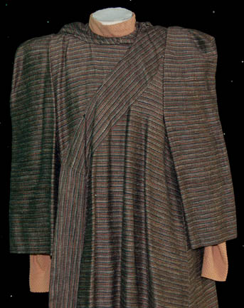 Description: A three piece costume featured in the legendary Star Trek: The Next Generation episode “Unification, Part I” for wear by Brent Spiner as “Data” while portraying a ‘Romulan' civilian. Having discovered “Spock” (Leonard Nimoy) on the Romulan home world, they send “Captain Picard” (Patrick Stewart) on a fact finding mission to determine if their renowned ambassador is a defector. While searching the cities with Data they don the clothes of Romulan civilians, a pair of cropped trousers and a long sleeved undershirt with a large outer robe, squared off at the shoulders. The garments feature sewn in tags reading ‘Brent’, the costumer’s tag reads ‘TNG #208 Unification, DATA, Brent Spiner, as Romulan’ and indicates the components.