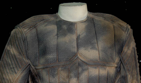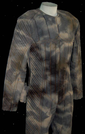 Description: The “Arkonian's” are a reptilian humanoid species featured in the Star Trek: Enterprise episode “Dawn”. “Zho’Kaan” (Gregg Henry) was a crewman onboard the Arkonian destroyer that worked with “Captain Archer” (Scott Bakula) and the Enterprise so they could both locate their missing crewmen. This costume was worn by the stunt double and is a long sleeved jumpsuit made of neoprene covered with camouflage green fabric and raised chevron ribbing on the sides and sleeves. There is a zip up the front and loops on the side for the accompanying gun holster to attach. Costume comes complete with costume tag.