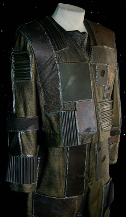 Description: The Retellians are a humanoid race with distinctive ridges to their nose, forehead and chin. They were featured in the Star Trek: Enterprise episode “Precious Cargo” in which the Retellian “Firek Goff” (Scott Klace) and his brother attacked a “Krioian transport” ship. This costume was worn by renowned stunt actor Vince Deadrick in the stunt role of Firek Goff. It includes a metallic green vinyl jacket with ribbed rubber components and neoprene sections. Intentional distress marks are sporadically placed over the surface. Worn underneath is a sleeveless metallic green vinyl jumpsuit also with neoprene components and intentional distress. Costume comes complete with costume tag.