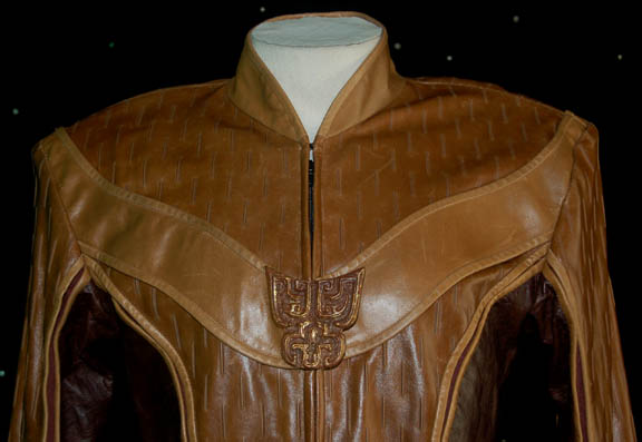 Description: This great costume was made for a Vulcan in the Star Trek: Enterprise episode, “Carbon Creek”. The jacket is made of brown and tan leather with a broken-line pattern on the tan sections. There are also tan pleats down the sleeves. It zips up the front and has a cast resin Vulcan medallion on the breastbone painted brown and gold. The matching pants are lined brown leather with tan pleats down the front and back of each pant leg. They are held up with attached black elastic suspenders and have brown elastic stirrups on each foot. Costume comes complete with costume tag.