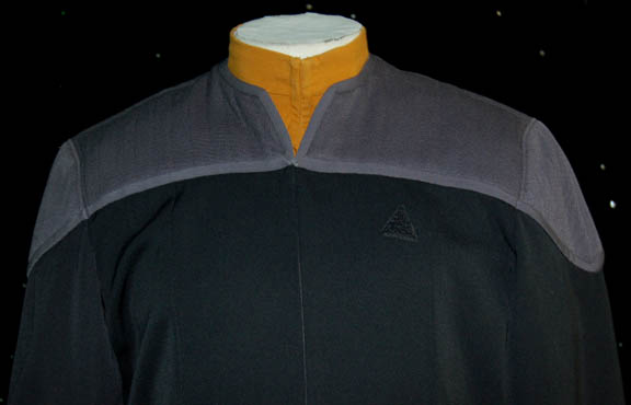Description: “Data” (Brent Spiner) was the beloved Soong-type android from the Star Trek: The Next Generation series. As the one and only android being to enter Starfleet, Data strove to learn as much as possible about what it means to be human. The sewn in tag on the jumpsuit reads “Data, #1, Brent” however this has been crossed out and “Stand in” has been written over it. It also says “wetsuit” possibly referencing that this costume was originally used by Spiner during the Star Trek: Insurrection feature in which “Data” is seen under water in his uniform. It is likely that the costume was later reused by ‘stand-in' actors. The jumpsuit is black with grey quilted shoulders and loops around the waist for ‘away team’ gear to fit. The cuffs have been removed from the costume. There is a small Velcro patch on the left side of the chest for a Combadge (sold separately) to attach. Worn underneath the jumpsuit is an operations gold shirt that zips up the front. The outfit Includes a pair of boots. The inside tag reads “B. Williams – Stunt Data”.