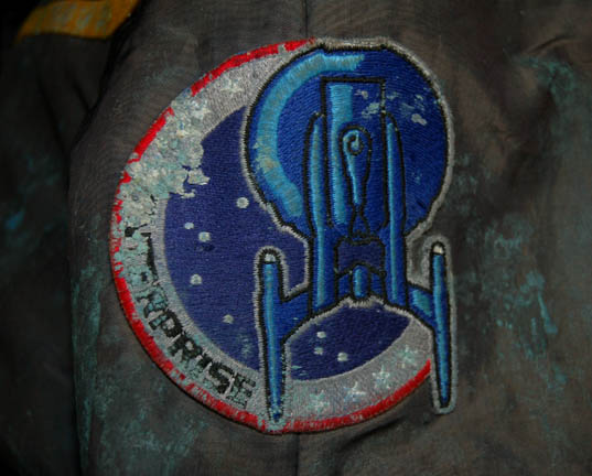 Description: A costume jacket featured in the episode “The Xindi” of the legendary third season of Star Trek: Enterprise for wear by “Captain Archer” (Scott Bakula). When the crew of the “Enterprise NX-01” enters the treacherous Delphic Expanse they locate a single member of the mysterious Xindi species living in servitude in a mine. Archer seeks him out and is trapped on the planet but secures his escape with the help of the Xindi through the sewers of the polluted mine. The item is the jacket worn in the episode, distressed to appear soaked in ‘pollutants' with dried special effects ‘goo’ present throughout. It is an Enterprise-style away team jacket with command gold division stripes around the shoulders, a centered zip front and three functional zippered pockets, zip and Velcro size adjustments at the cuffs, a sewn on “Enterprise” assignment patch affixed to the left shoulder. The jacket is made from dark gray reflective nylon with a black interior lining; the sewn on Enterprise tag reads ‘Scott Bakula’ and the costumer’s tag reads ‘Archer, Scott Bakula, Away Jacket, Distressed.’