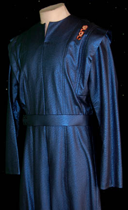 Description: Captured by a massive industrial consortium and brainwashed into believing that they have been part of the employees of this company forever, the crew of “Voyager” wore jumpsuits like this one in the episodes “Workforce, Parts I and II” of Star Trek: Voyager. A shiny blue jumpsuit with a matching belt, a zip up the front, and an orange and white sewn in division patch on the left shoulder front depicting ‘Quarren' character letters. Made by ‘MUTO Little, Los Angeles’ the costumer’s tag indicates use in the episode “Workforce”.