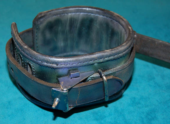 Description: Two pair of metallic purple painted leather manacles both with an assortment of straps and buckles with Velcro adjustments. The larger set features a chain and a metal bar separation, the smaller set features a bar separation. Believed to have been used on “Captain Archer” (Scott Bakula) during the episode “Azati Prime” of Star Trek: Enterprise. Measures approx. 14 X 7 inches.
