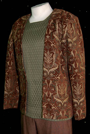 Description: “Zahir” (David Lee Smith) was a Mikhal Traveler who offered to help the U.S.S. Voyager find a way back to the Alpha Quadrant in the Star Trek: Voyager episode “Darkling”. The top is brown and green patterned with a quilted green diamond design front and a zip up the back. The pants are brown cords. Costume comes complete with costume tag.