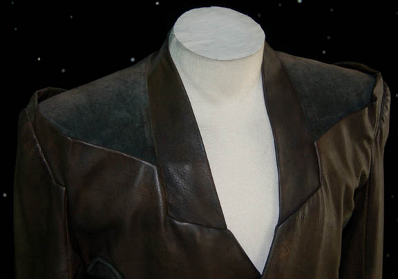 Description: This jacket was originally featured on a soldier in the Star Trek: Voyager episode “Remember” according to the accompanying costume tag. As indicated by the sewn in tag, it was later reused in the more memorable role of “General Valen” (Robin Sachs) who was the commander of an Annari vessel lost in a void in the Star Trek: Voyager episode “The Void”. Made of black leather with suede sides and shoulders, the jacket has a zip up the front and three snaps. There are belt loops on each side.
