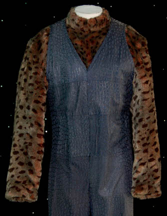 Description: “Trajis Lo-Tarik” (Wade Williams) was a fictional alien created in the mind of “Seven of Nine” (Jeri Ryan) after her sensory nodes were affected in the Star Trek: Voyager episode “One”. The blue sleeveless jumpsuit is made of patterned leather with a V-neck and a zip up the back. A faux fur top with a leopard print design is worn underneath. Costume comes complete with costume tag.