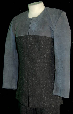 Description: “Sarish Rez” (Bruce Wright) was a Bajoran and First Minister Shakaar Edon's adjutant who accompanied him to the Deep Space Nine station for negotiations on Bajor’s entry onto the United Federation of Planets. Featured in the Star Trek: Deep Space Nine episode “Crossfire” the costume includes a gray smock style top with suede shoulders and sleeves and a woolen lower section. The matching pants are also gray wool. Costume comes complete with costume tag. The sewn in tags also indicate that this costume was reused during the Star Trek: Voyager series.