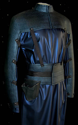 Description: A miner's costume lot from the Star Trek: Voyager episode “Destiny”. Two blue vinyl jumpsuits with zips up the front. Each jumpsuit has a hole along the seam at the crotch where the thread snapped. One blue neoprene shoulder and waist harness is included with black straps fitting it to the body. A plastic holster is on the side. Costume comes complete with costume tag.