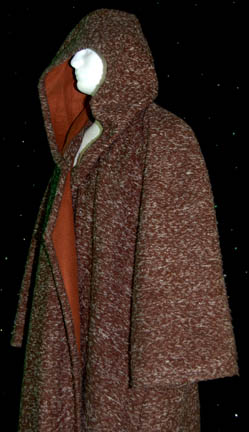 Description: In the Star Trek: Voyager episode “Unity”, the U.S.S. Voyager discovers a group of humanoid people living on a planet who were formerly Borg but had dissimilated themselves. This large over robe was worn by one of the former Borg humanoids and is made of brown and gray wool with a hood and brown fleece lining. Costume comes complete with costume tag. The sewn in tag indicates that the robe was also during the Star Trek: Deep Space Nine series.