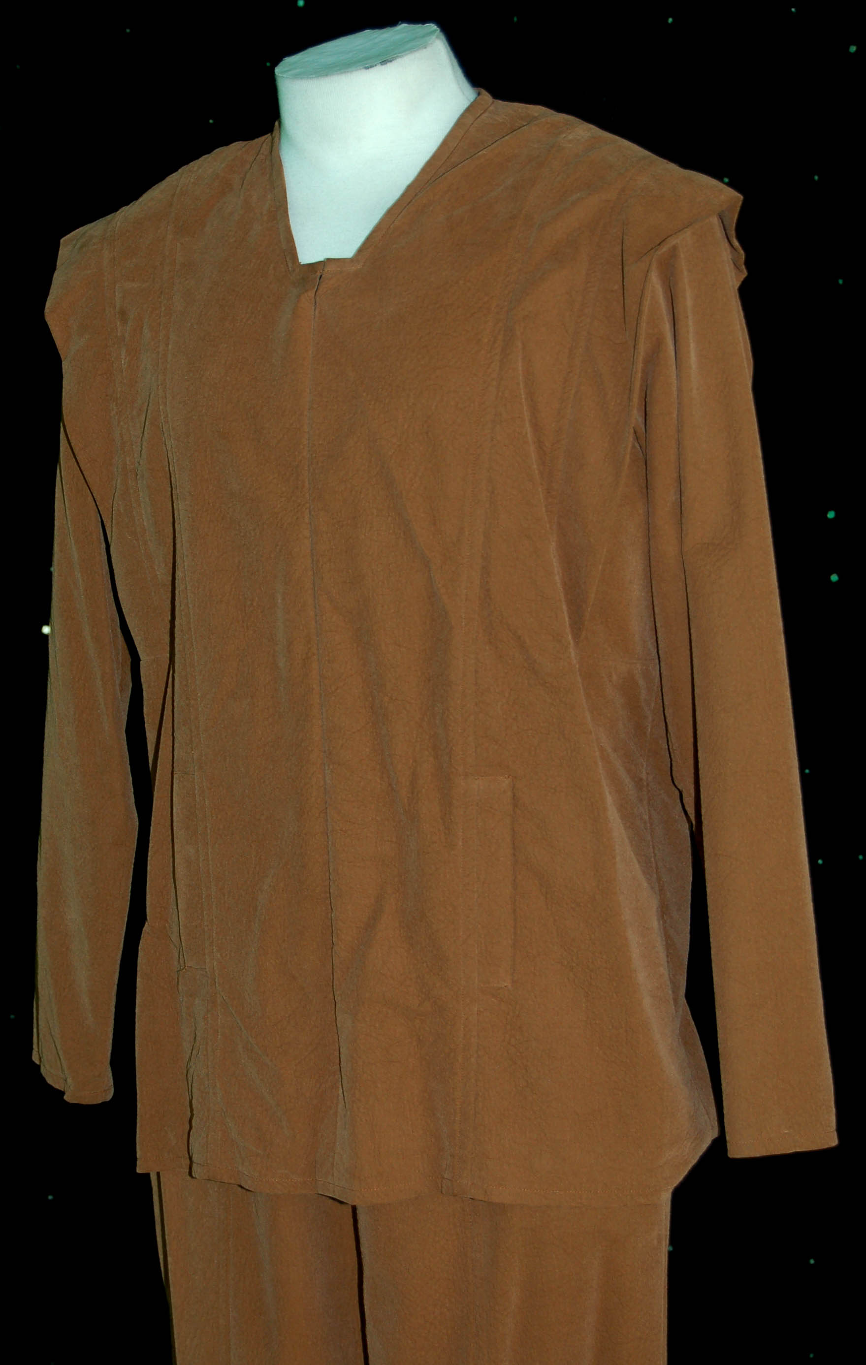 Description: Captured by a massive industrial consortium and brainwashed into believing that they have been part of the employees of this company forever, the crew of “Voyager” wore jumpsuits like this one in the episodes “Workforce, Parts I and II” of Star Trek: Voyager. The costume was worn by a “Med. Tech.” and includes a brown shirt that zips at the front and has pleated detail around the shoulders along with a pair of matching brown pants. Costume comes complete with costume tag.