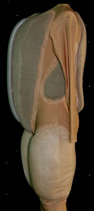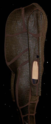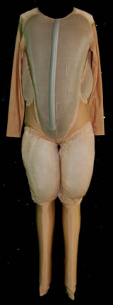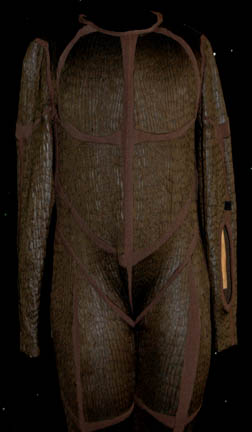 Description: A stunt costume featured in the Star Trek: Voyager episode “Distant Origin” for wear by a “Voth”, beings distantly related to dinosaurs from Earth. The costume is made up of a form fitting undershirt, a pair of matching padded trousers to give the wearer a distinctly alien appearance, a similar chest piece, and an outer jumpsuit made of brown colored faux reptile skin fabric with wavering trim accents. The costumer's tag reads ‘#165 Distant Origins, Dennis Madalone’ and is stamped ‘Voyager’.