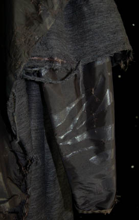 Description: The Bajorans are a humanoid species native to the planet Bajor and were seen throughout the Deep Space Nine series as well as various episodes of Star Trek: The Next Generation and Voyager. This costume was worn by an elderly Bajoran male called “Mr. Lamonay S. (Tom Klunis) who mysteriously appeared on a Bajoran transport's passenger list in the Star Trek: Deep Space Nine episode “A Man Alone”. There are two black over robes with layered multi fabric sleeves and intentional distress. There are also two pairs of gray pants. Costume comes complete with costume tag. The sewn in tags indicate the costumes were reused by other actors.