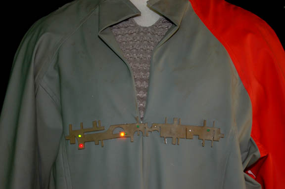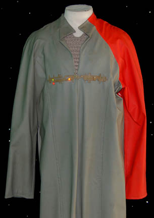 Description: The U.S.S. Voyager's first encounter with the Nygean species was in the Star Trek: Voyager episode “Repentance” in which the Voyager rescued one of their prison ships and passengers. This costume was worn by a Nygean prisoner and includes a sage green vinyl jumpsuit with an orange left sleeve and a zip up the back. There is a hole under the left arm. Across the chest is a geometric rubber panel with built in LED lights of various colors. They are activated by a standard 9volt battery worn on a belt under the suit. Due to time and use, only three of the lights appear to be in working order. A sage green sleeveless top is worn under the jumpsuit with a raised circular pattern. Costume comes complete with costume tag.