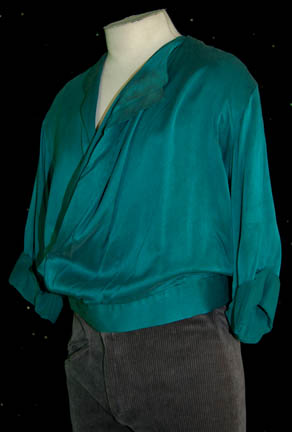 Description: A costume shirt featured in the Star Trek: The Next Generation episodes “Family” and “Starship Mine” with trousers corresponding to the latter episode. The aqua colored shirt features an asymmetrical front that fastens with snaps and clasps across the body and permanently rolled up sleeves while the trousers are grey riding pants made from corduroy with a diagonally opening pocket on the right front and leather knees for saddle use, as well as a dark maroon jacket with two differing fabrics. The costume in its current configuration is representative of “Captain Picard” as portrayed by Patrick Stewart in the episode “Starship Mine” wherein a group of terrorists attempt to steal tri-lithium from the deactivated warp core of the “Enterprise-D” and the only person who can stop them is the captain himself! A shirt like the one in the lot was featured in the emotional episode “Family” in which Picard returned to Earth after his crippling stint as the human speaker for the Borg Collective. The interior of the trousers have been inscribed ‘Patrick'.