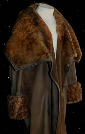 Description: A large fur lined leather costume coat featured in the Star Trek: Voyager episode “Live Fast and Prosper” for wear by “Varn” (Ted Rooney), an alien who bought into a con to join the Federation by thieve pretending to be the crew of “Voyager”. The coat is practical and extremely large with an oversized collar and no center seal. The costumer's tag reads ‘242 Live Long and Prosper, Varn, Ted Rooney’.