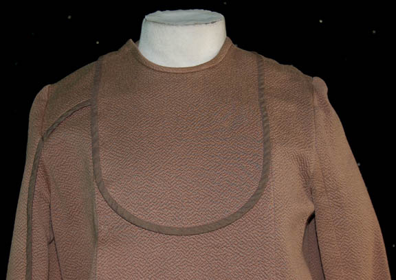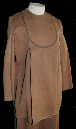 Description: “Doctor Ma'Bor Jetrel” (James Sloyan) was a Haakonian scientist who led a scientific team to create a super weapon called the metreon cascade. It was similar to an A-bomb that was used against the Talaxians ending the Tarlaxian-Haakonian war in the Star Trek: Voyager episode “Jetrel”. The costume lot includes two identical jackets made of brown textured material that snaps shut along the right side. A discrete slanted pocket is underneath the flap. The scooped neck is copied with a scooped built-in bib section. One pair of matching pants are also included. Costume comes complete with costume tag.