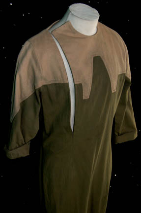 Description: The alien who wore this costume was a miner working on Harod IV who was picked up by the U.S.S. Enterprise-D and taken to his next destination by the crew in the Star Trek: The Next Generation episode “The Perfect Mate”. The green jumpsuit has cuffs on the sleeves, beige corduroy shoulders in a geometric pattern and a zip up the front. The zip ends just above waist height leaving the top section as an open flap. Costume comes complete with costume tag.
