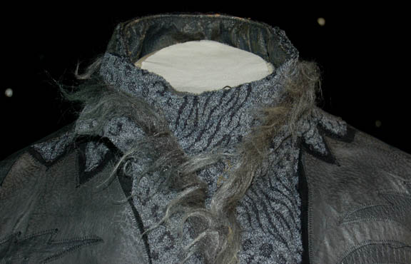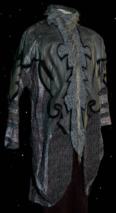 Description: A costume featured in the Star Trek: The Next Generation episode “Lonely Among Us” wherein the “Enterprise-D” receives a delegation of alien dignitaries who share a weighty animosity. One of the species are the Anticans, a dog-like race who wore costumes like this. The item is a pair of black trousers with a green long sleeved shirt and an outer top with multiple woven fabrics patterned leather with black accent trim and a sturdy zip up the center of the chest hidden by a streak of fur and a snap system. The costumer's tag reads ‘108 “Lonely Among Us” Antican Diplomat, Steve Cassavantes’, and sewn in Deep Space Nine tags indicate further use in other Star Trek series.