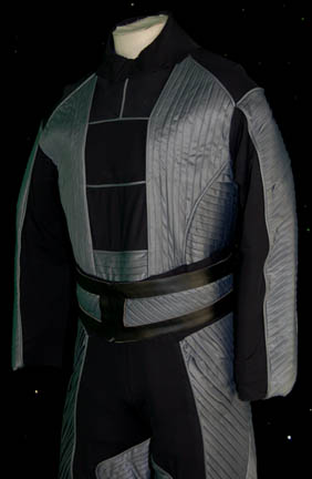 Description: A costume featured in the legendary Star Trek: Deep Space Nine episode “Blood Oath” in which the living legends “Kor” (John Colicos), “Koloth” (William Campbell), and “Kang” (Michael Ansara) visit “Deep Space Nine” on their way to kill their arch enemy and inadvertently come across “Jadzia Dax” (Terry Farrel), carrier of the ‘Dax symbiont' who keeps the memories of the god father to their assassinated children. It is during their battle to enter the fortress of their nemesis “The Albino” (Bill Boleneder) that the Klingons and their Trill companion wreak havoc on these soldiers, a personal protection force assembled to eliminate any intruders; their costumes are comprised of an incredibly detailed jumpsuit made from neoprene and other synthetic materials. The outside and inside of the legs are pleated and ribbed silver fabric as are the outside sleeves and the ribs. The rest of the costume is black and comes with a matching belt with black leather trim. The costumer’s tag reads “# 439 Blood Oath, Guard #8’.