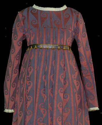 Description: This costume was featured in the Star Trek: The Next Generation episode “Thine Own Self” wherein “Data” (Brent Spiner) suffers amnesia while on an away mission to collect radioactive fragments from a probe that crash landed on the pre-industrial planet of Barkon IV. The costume is a mauve and blue renaissance style dress with slip and under dress sewn in for wear by Kimberly Cullum in her portrayal of “Gia” and comes with a pair of matching mauve leggings. The costumer's tag reads ‘#268, Thine Own Self, Gia, Kimberly Cullum’
