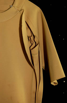 Description: An unfinished mustard colored uniform top with short sleeves, a missing zip placement, and stitched in hem lines. The costume appears meant for use in the ill fated Star Trek: Phase II which never made it to screen, yet elements of which eventually evolved into episodes of Star Trek I: The Motion Picture and Star Trek: The Next Generation. This supposition is based around where it was located and by the type of fabric involved in it's construction.