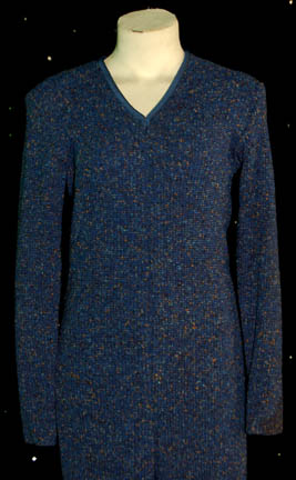 Description: In an alternate reality “Miranda O'Brien” (Jennifer Parsons) was the descendant of Starfleet officer “Miles O’Brien” and Rita Tannenbaum who lived on the planet Gaia in the Star Trek: Deep Space Nine episode “Children of Time”. The blue knitted jumpsuit has flecks of yellow and pale blue knitted in, a V-neck and a zip up the front. Costume comes complete with costume tag.