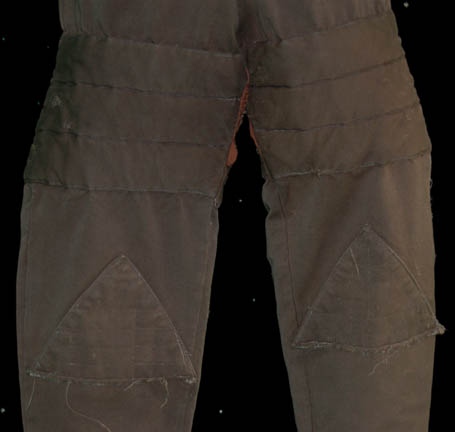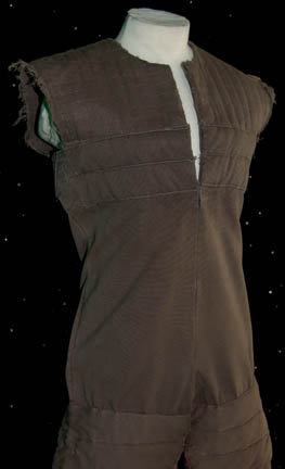 Description: This sleeveless gray jumpsuit was worn by a prisoner in the Star Trek: The Next Generation episode “The Hunted”. It has quilted padding around the torso and thighs and a zip up the front. The arm holes are frayed and there is intentional distress snags over the surface. Costume comes complete with costume tag. The sewn in tag indicates this costume was reused during the Star Trek: Voyager series.