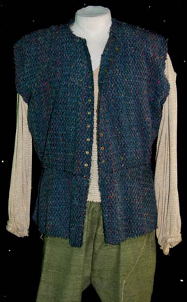 Description: A costume featured in the Star Trek: The Next Generation episode “Who Watches the Watchers” for wear by “Commander Riker” portrayed by Jonathan Frakes while the character masqueraded as a native of Mintaka III. The costume is a pair of green cropped trousers made from woven fabric, a cream colored shirt with draping long sleeves and a knitted vest with a blue tint and multiple metal lace grommets. The costumer's tags reads ‘#152 Who Watches the Watchers”, Riker Johnathan Frakes’ and indicates the components. A sewn in Deep Space Nine tag reads ‘Duane King’.
