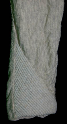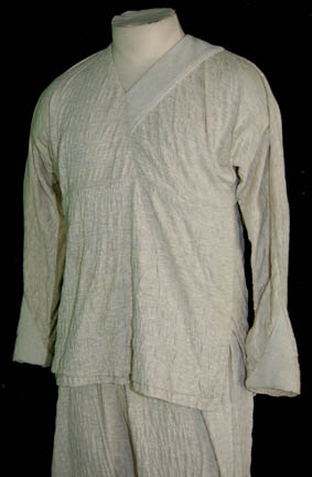 Description: A costume featured in Star Trek: The Next Generation for wear by veteran stunt performer Holiday Freeman. The costume is a two piece off white colored outfit presumably appearing in various Klingon Mok'Bara sessions led by “Worf” (Michael Dorn) in various episodes like “Clues”, “Second Chances”, and “Lower Decks”. The costumer’s tag reads ‘TNG Tai Chi Outfit, Holiday Freeman’ and lists its components.