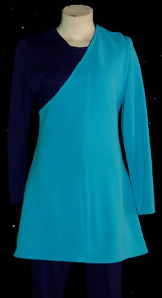 Description: A costume blue colored dress with a purple sleeve and attached purple trousers. The costume zips up the back and was located with other similar costumes appearing to have been featured in the Star Trek: Enterprise episode “Oasis”.