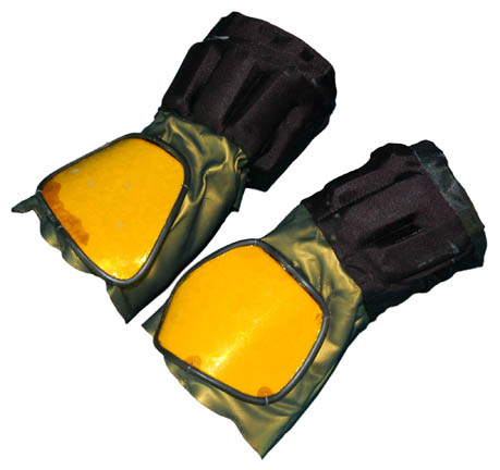Description: The Tsunkatse fighters were forced to take part in the deadly sport called Tsunkatse as seen in the Star Trek: Voyager episode of the same name. This costume is made up of a sleeveless metallic green vinyl jumpsuit with a matching harness; a pair of fingerless gloves with black nylon wrists and orange colored back of the hands (the polaron disruptors). The light up gloves still have some of their original battery power left and they appear to run on six AAA batteries each. The matching Nike boots also appear to have had light up capabilities at some point however part of the electronics are missing from each boot. That said, the costume still looks good even without the light up boot features! Costume comes complete with costume tag.