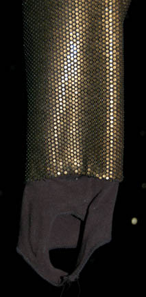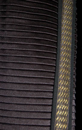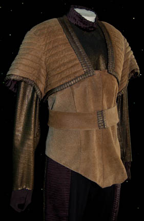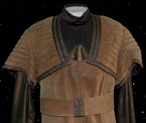 Description: A costume featured in the Star Trek: The Next Generation episode “Suddenly Human” for wear by Sherman Howard in his portrayal of “Endar”, an intelligent, but antagonistic alien adversary of the Federation. His elaborate costume consists of a pair of black pleated trousers with gold trim accents, and a leather top with black sleeves made with bronze colored metal ‘chain mail', and a matching leather belt that clasps at a section of gold trim, the helmet is shaped and features adhered fabric matching the sleeves of the top with gold colored dot accents. This excellent costume comes with a costumer’s tag reading ‘#176 Suddenly Human, Endar, Sherman Howard’ and lists the inclusion of the helmet.