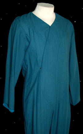 Description: This costume was made for the Star Trek: The Next Generation episode “The Neutral Zone” in which the U.S.S. Enterprise comes upon a ship carrying 20th century Humans who were cryogenically frozen. The humans wore this style of costume after they were unfrozen and treated for the illnesses that had required them to be frozen in the first place. It is a turquoise jumpsuit with a V-neck and a zip and snaps at the front. Costume comes complete with costume tag.