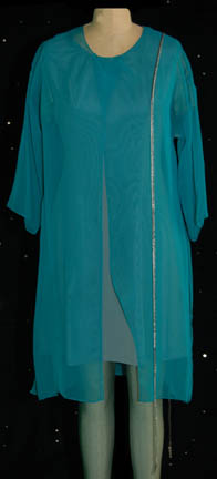 Description: The “Qomar” are a humanoid species known for their xenophobic and arrogant attitudes. Due to their vocal anatomy they are unable to produce musical notes and were therefore fascinated when they heard the “Doctor” (Robert Picardo) humming a tune in the Star Trek: Voyager episode “Virtuoso”. This is female Qomar “Tincoo's” (Kamala Dawson) costume that includes a sage green jumpsuit with built in feet and a zip up the back. Worn over the top is a sleeveless sage green dress. The last layer is a shear light weight flowing teal robe with snaps at the neck. Sage green tights accompany the costume as well as a thin silver and black belt with metal tips. Costume comes complete with costume tag.