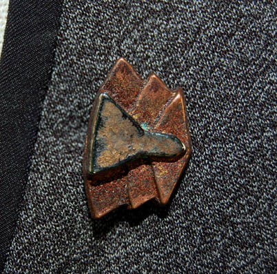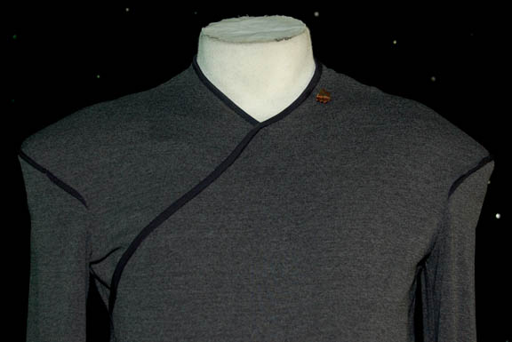 Description: A costume featured in the Star Trek: Enterprise episode “Fallen Hero” for wear by a “Vulcan Captain” (Dennis Howard). The costume is comprised of a grey jumpsuit with black piping trim and a zip up the back. The neck of the costume features a pair of snaps for the attachment of an accompanying metal pin indicating the rank of ‘captain' colored silver and bronze. The costumer’s tag reads ‘Enterprise #023, Vulcan, Dennis Howard’ and indicates its components.