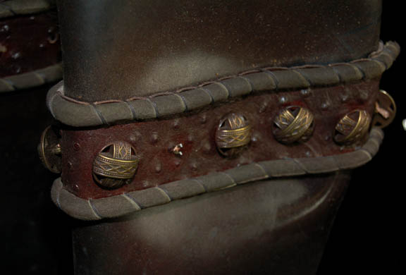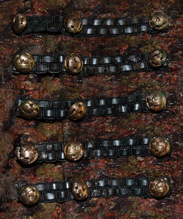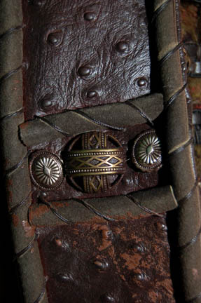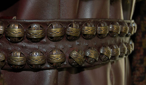 Description: “Ulis” played by veteran Star Trek actor, Ethan Phillips, was a Ferengi pirate featured in the Star Trek: Enterprise episode “Acquisition” in which Ulis and a group of Ferengi pirates knock out the entire crew of the U.S.S. Enterprise NX-01 in order to loot the ship. Two other famous Star Trek veteran actors also played Ferengi pirates in this episode including, Clint Howard as “Muk” and Jeffrey Combs as “Krem”. Unfortunately for the Ferengi, “Commander Trip Tucker” (Connor Trinneer) is unaffected and their plans are foiled. It should be noted that the Ferengi never identified themselves to the crew of the Enterprise NX-01 and therefore it wasn't considered ‘first contact’ with the species. The Ferengi and humans wouldn’t make first contact until the Star Trek: The Next Generation episode “The Last Outpost”. The costume includes a brown vinyl sleeveless jumpsuit that zips up the back and a woolen striped and multicolored cropped jacket with fifteen metal buttons across the chest. An elaborate harness made of brown leather with numerous metal and resin buttons wraps around the waist and over the shoulder. The long fleece coat is earth tone colors with two coattails in the back that culminate in large knots. There is a stylized flap in the back, faux pockets and copper color metal accents attached to wooden buttons on the front. The coat is distressed intentionally to give a worn and used appearance. Brown distressed leather gloves and brown decorated vinyl boots are also included. Costume comes complete with costume tag.