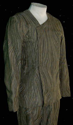 Description: An outfit featured in the Star Trek: Enterprise episode "Chosen Realm" where the “Enterprise NX-01” is hijacked by religious extremists who worship the mysterious spheres of the Delphic Expanse. The costume has an olive and tan swirled fabric with pants to match. The jacket is double-breasted with several clasps and buttons holding it securely closed, and comes with a pewter metal badge used by the aliens in the episode to detonate powerful organic explosives within them. Two sewn in tags read "Gregory Wagrowski #64" and "Alexander Slanger" respectively. The costumer's tag reads "Enterprise #64, "Chosen Realm", "Ceris", "Greg Wagrowski".