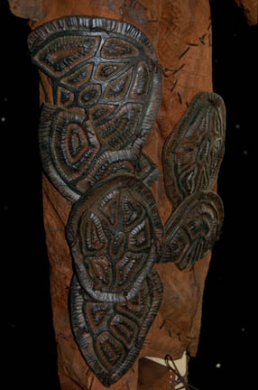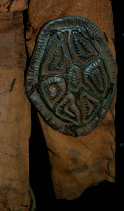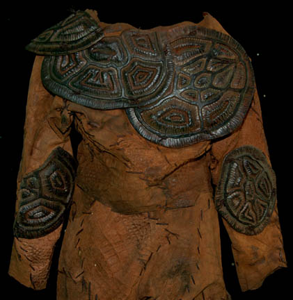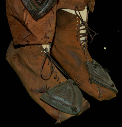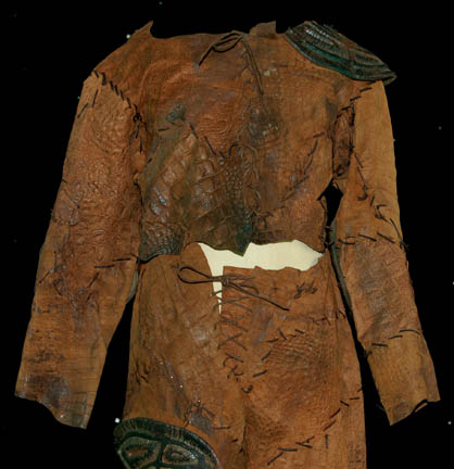 Description: The ‘Novans' are a colony of humans living on the planet Terra Nova who were investigated by Captain Archer (Scott Bakula) and his away team during the Star Trek: Enterprise episode “Terra Nova”. Both the pants and cropped top are made of brown roughly cut leather pieces that have been hand stitched together. Attached to the legs, arms and shoulder and back are pieces of sculpted latex that have been painted brown to resemble thick leather. The accompanying shoes are made of canvas covered in brown hand stitched leather with faux leather latex pieces attached on top. Costume comes complete with costume tag.