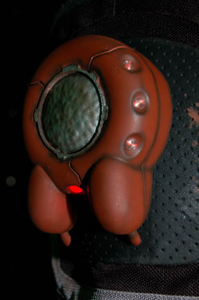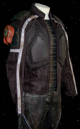Description: A costume featured in the Star Trek: Enterprise episode “The Anomaly” for wear by actors portraying Osaarian Pirates in the Delphic Expanse. The costume is a ‘First Gear' name brand motorcycle jacket and pants with multiple crash protection placements, size adjusting straps, zips, and reflective safety strips. The costume has been distressed with paint to appear worn and aged. The lot also come with a cast resin brown painted ‘transporter device’ which lights up in two ways when activated by separate switches. The item is powered by a single included 9volt battery with power still left over from production, accessed easily by three screws on the reverse. The costume garments feature sewn in Enterprise tags.