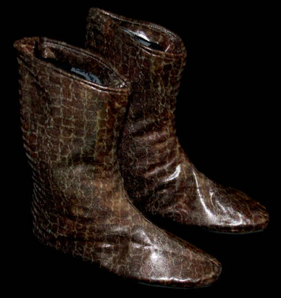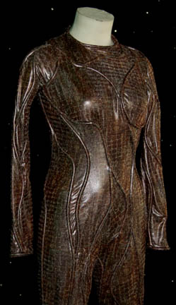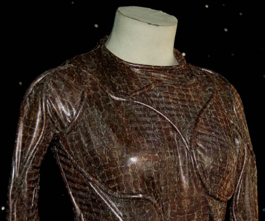 Description: This is a Xyrillian costume featured in the Star Trek: Enterprise episode “Unexpected”. Costume is a form-fitting jumpsuit of asymmetrical piping on a faux reptile skin design and pair of matching boots. Sewn in tag reads “Carmel” whereas the costumer's tag reads “005, ‘Unexpected’, N.D. Xyrillian, Christina Carmel”.