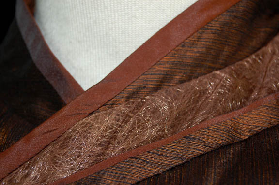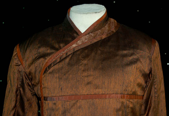 Description: A costume featured in multiple episodes of Star Trek: Enterprise for wear by actors portraying Vulcan characters. The costume is a pair of copper colored trousers with black line texture and a matching top with copper colored trim and an asymmetrical front. The costume appeared in the episode “Kir'Shara” for wear by “Koss” (Michael Reilley Burke), the betrothed and eventual husband to “T’Pol” (Jolene Blalock), and as various background Vulcans in the episodes “Fallen Hero” and “Awakening” as indicated by the costumer’s tag. The sewn in Enterprise tags indicate wear by various actors.